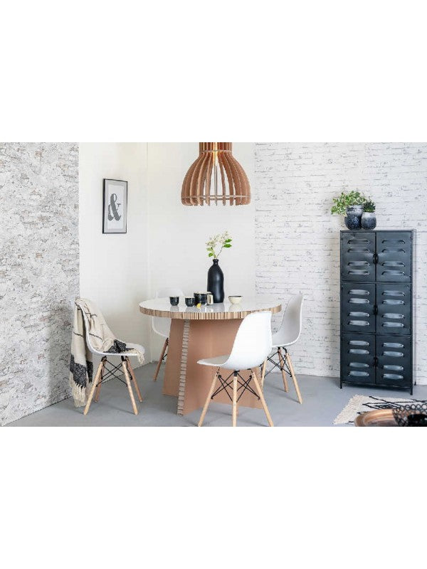 Deze lampenkap Tante Vera heeft een diameter van 56 cm en een hoogte van 61 cm en is gemaakt van diverse delen golfkarton. De lamp wordt ongemonteerd geleverd. Standaard zit er een zwarte kunststof hangpendel bij in begrepen.