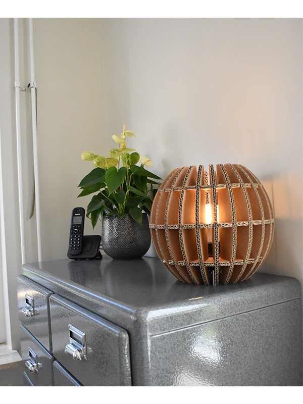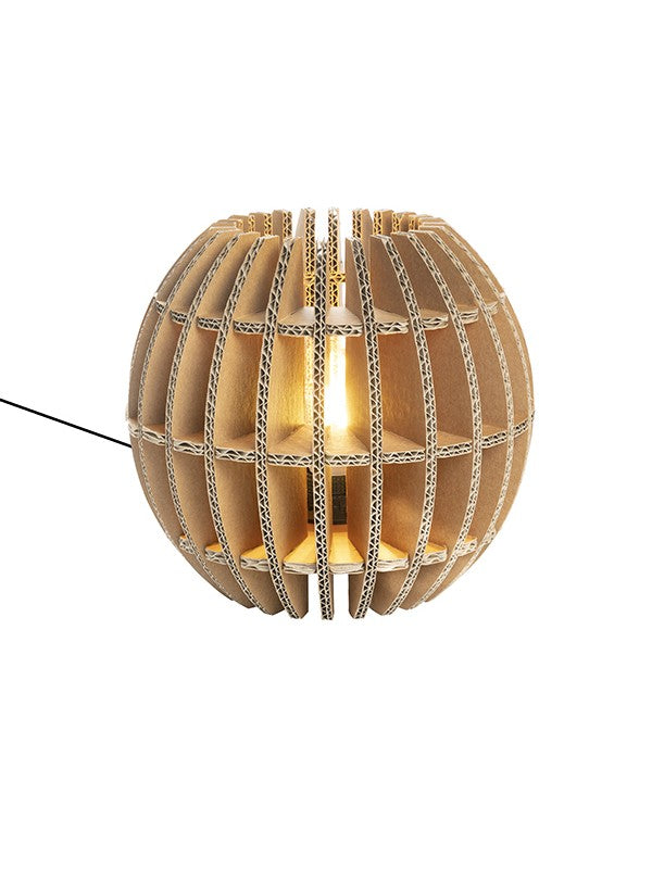 Een complete kartonnen tafellamp die je kunt bestellen. Je hoeft hem alleen nog even in elkaar te zetten, een mooi plekje te geven en in het stopcontact te steken.