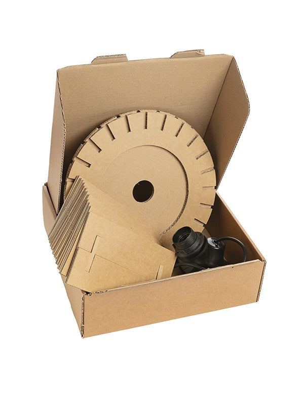 Een complete kartonnen lamp die je kunt bestellen en zelf in elkaar kunt zetten. Hoe leuk is dat! Alles zit compleet in de doos. 2 ringen, 24 schotjes en een zwarte kunststof pendel om hem op te hangen en de gebruiksaanwijzing. Je steekt de lamp eenvoudig in elkaar, je hebt geen lijm of schroeven nodig.